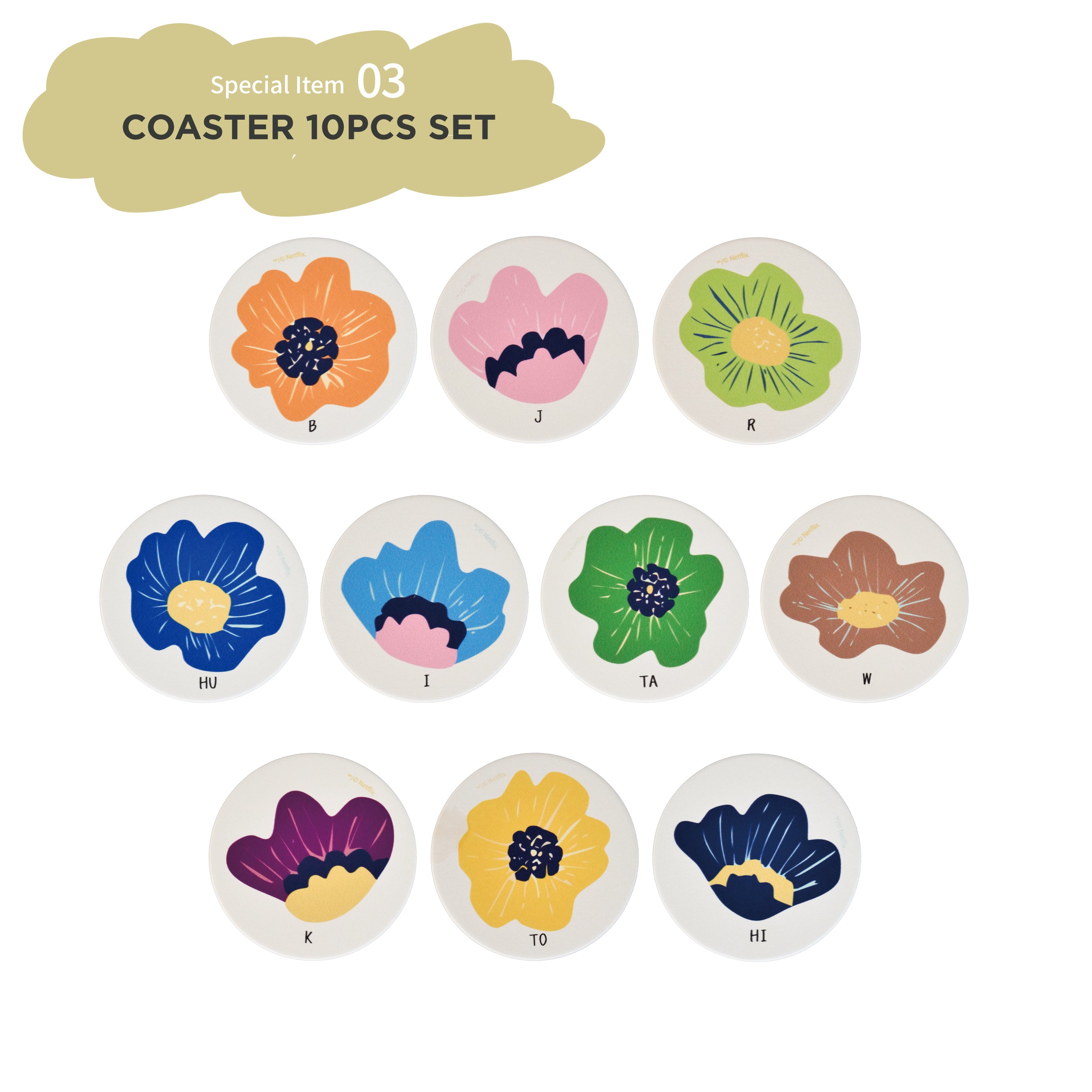 出演メンバーのHIROYAさんが作品中でデザインした花のアート全10柄を収めたコースターセット。